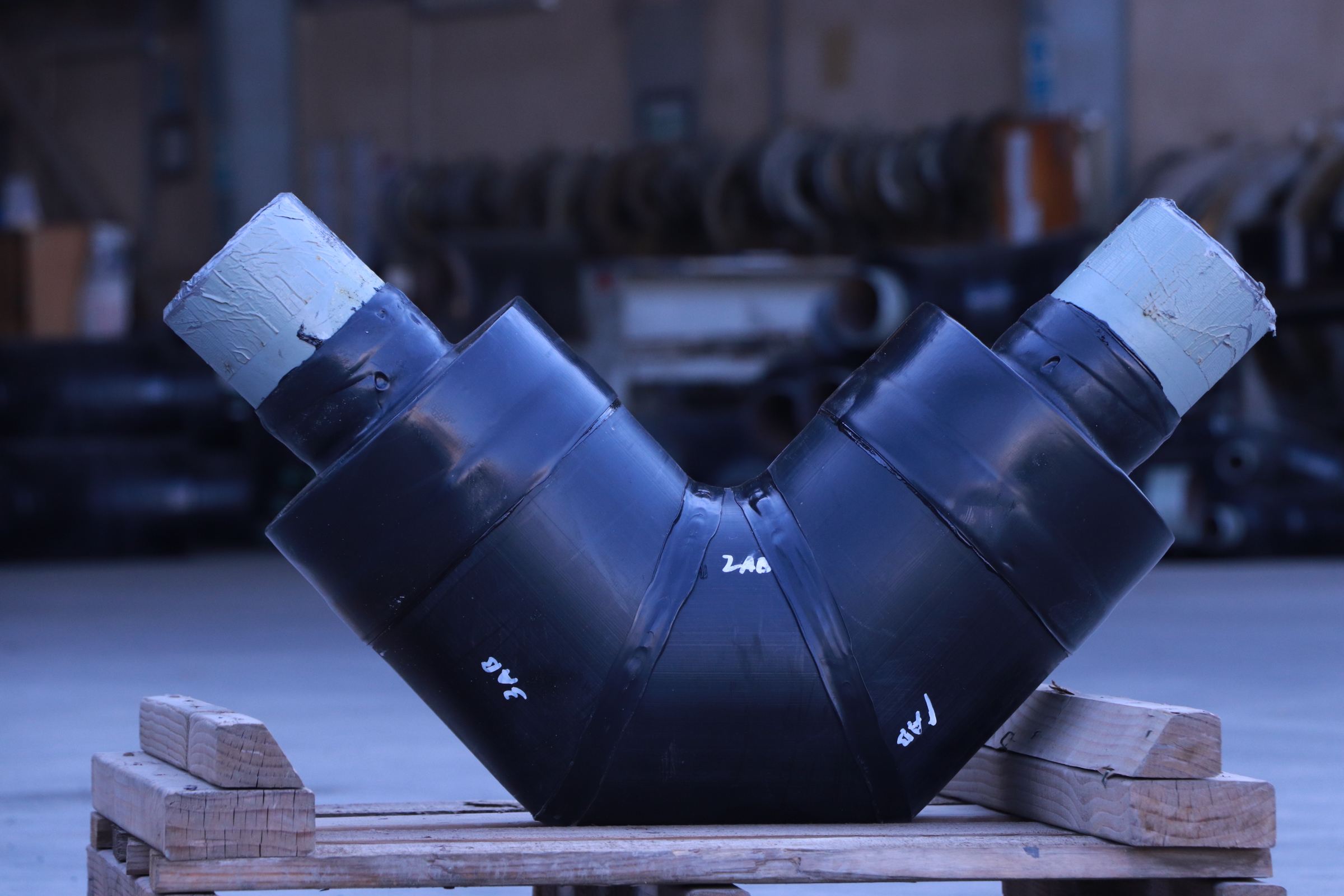 The steel core fittings are made of carbon steel ASTM A234 and the dimensions are according to ASME B16.9. All procured steel fittings undergo factory fabrication process whereby a minimum of 300 mm steel pipe piece is welded to each end of the fitting. The insulation is made of 100% CFC free polyurethane foam. The required amount of foaming mixture is injected into the cavity between the steel core fitting and the fabricated casing pipe via.